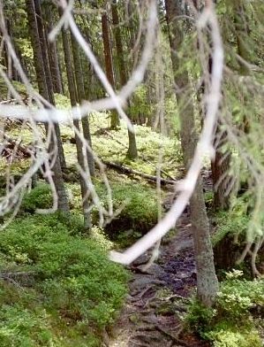 Es geht über Felsen, Berge, Moos, Morast und umgestürzte Bäume – der Weg ist mit orangenen Strichen und Punkten markiert. Die Natur ist einzigartig: unberührte Seen, versteckte Plätze, 12 Stationen mit immer neuen Entdeckungen.